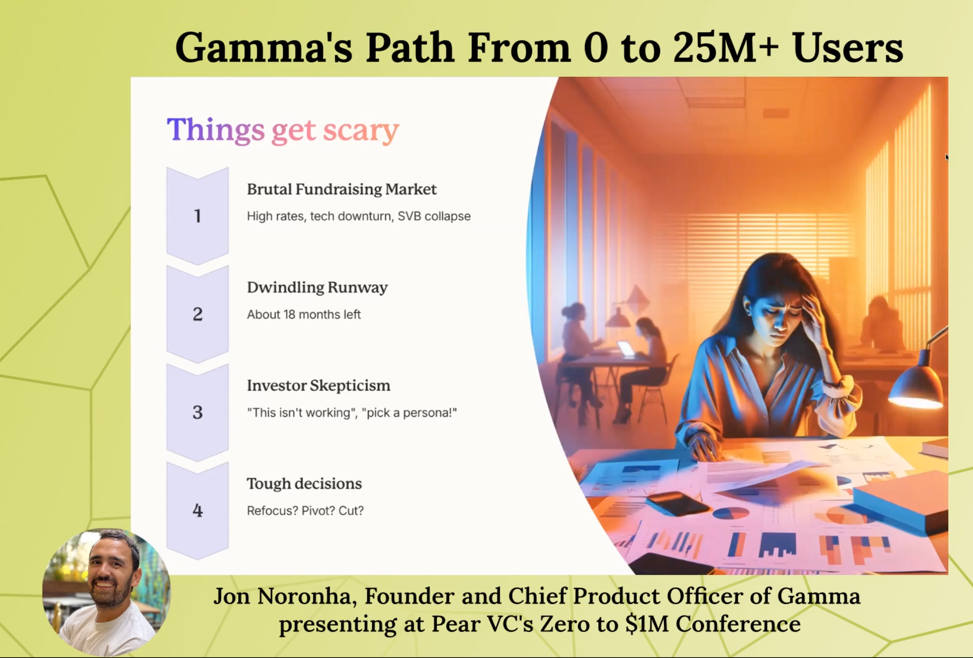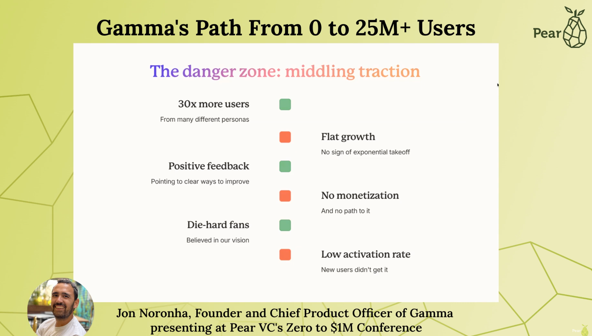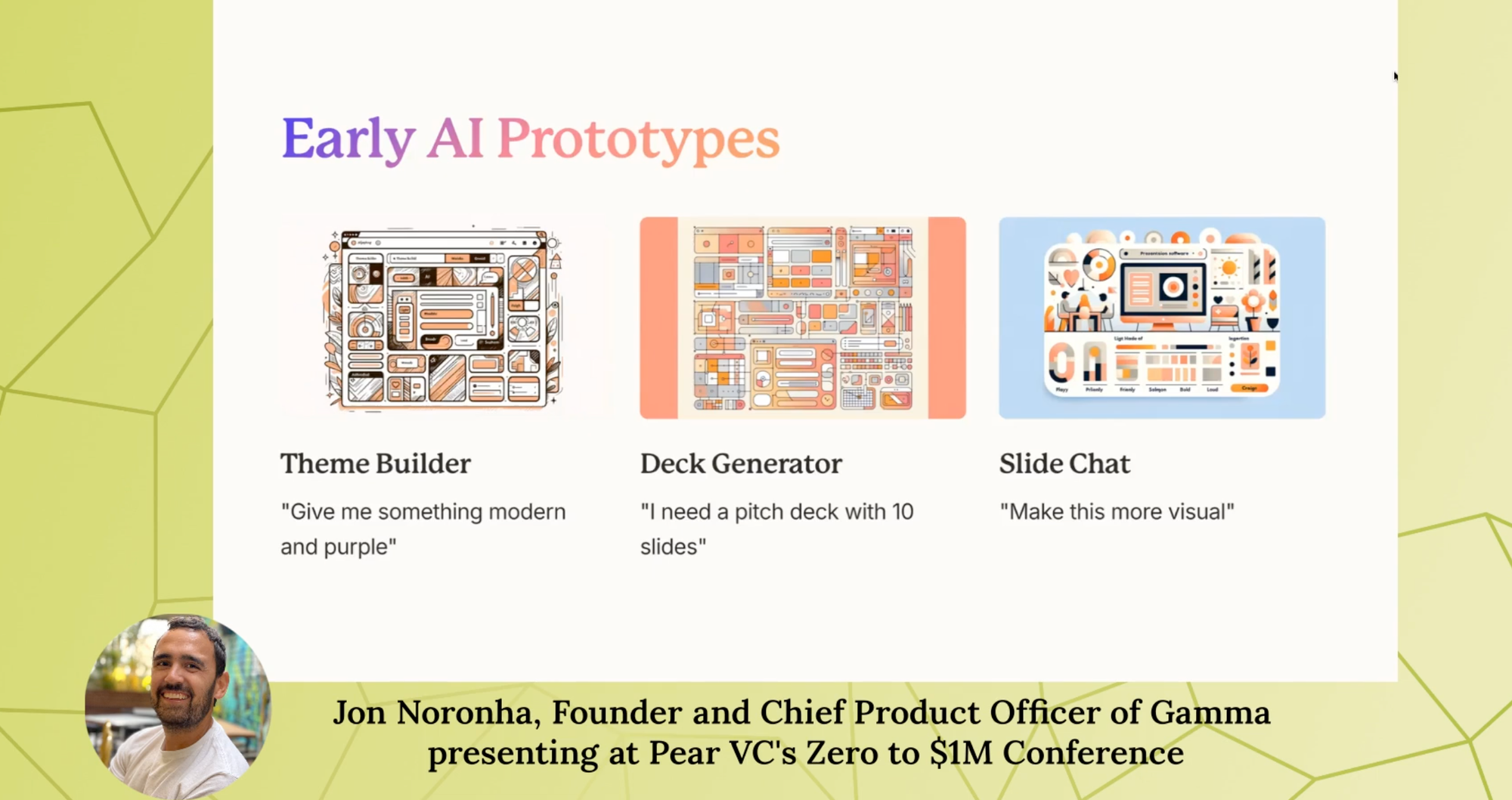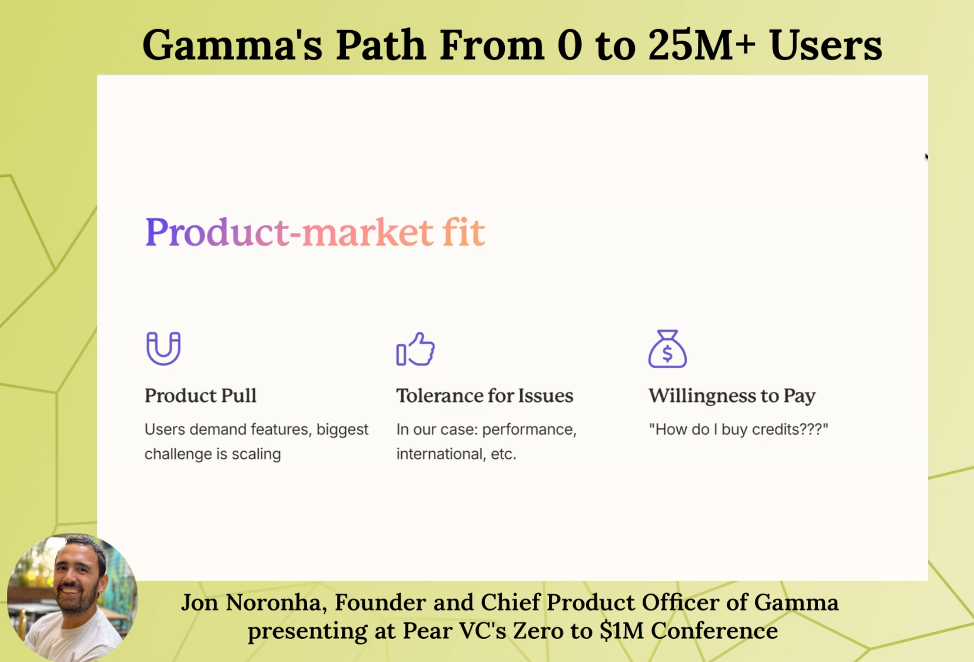 以下是Cofounder在Pear VC分享的故事: Zero to $1M: Gamma's Path From 0 to 25M+ Users,也有加了一些我的highlight