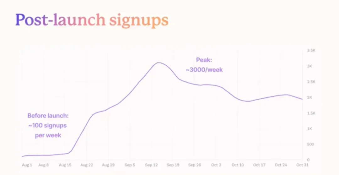 正如你在這裡看到的,我們看到了相當大的提升,達到了每週大約 3,000 人註冊 Gamma 的程度,這真的很驚人。3,000 人就像是想像這個房間乘以這層樓上的所有其他房間,那些人都在註冊嘗試你的產品,這真的很酷,真的很棒。現在,仍然有 98% 的人會登錄,按幾個按鈕,然後離開,所以那部分很糟糕,但仍然有某種驗證在這裡。